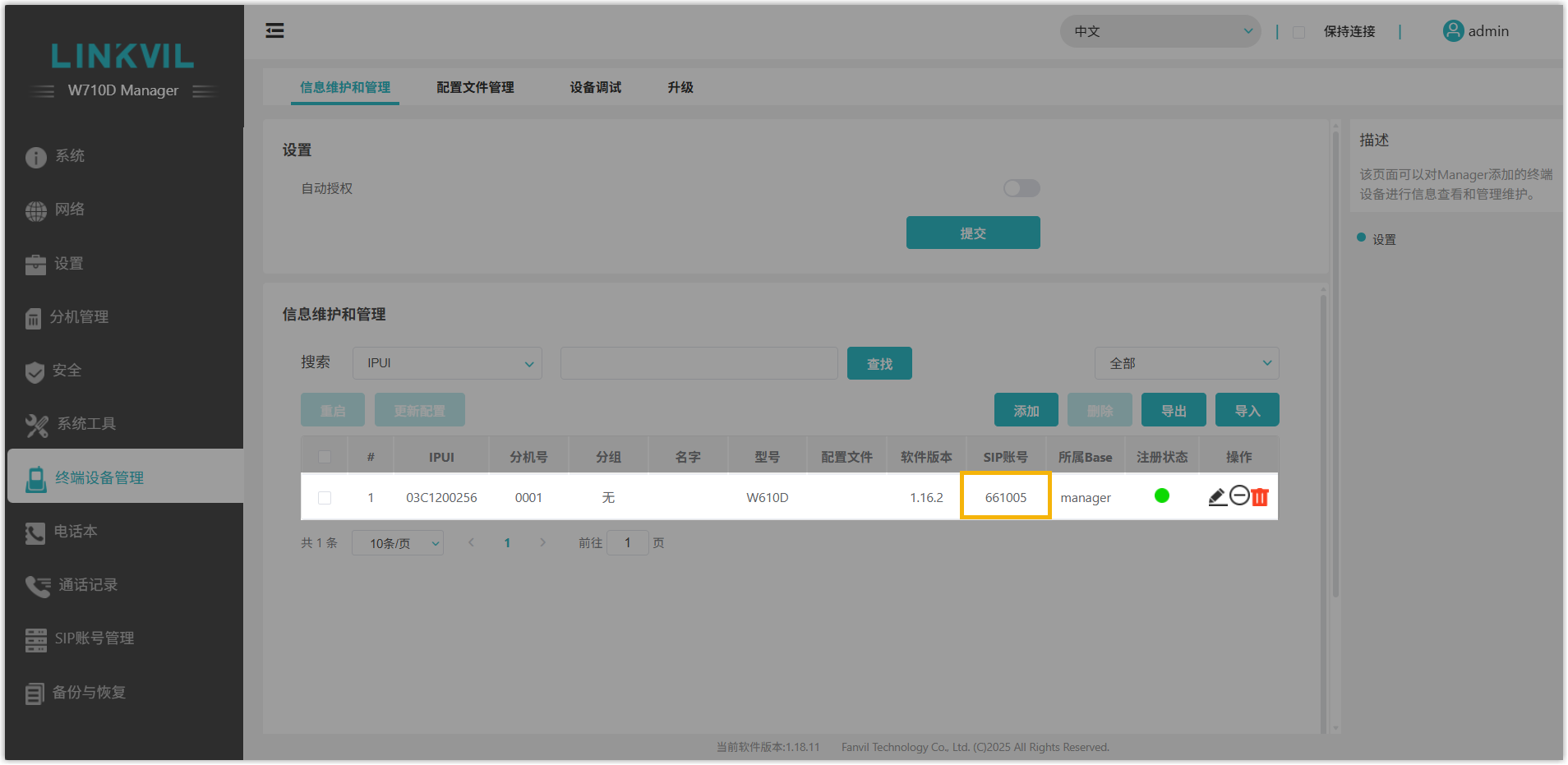 DECT 基站自动从 PBX 下载配置并应用。提示: 你可以点击 DECT 基站前面的
