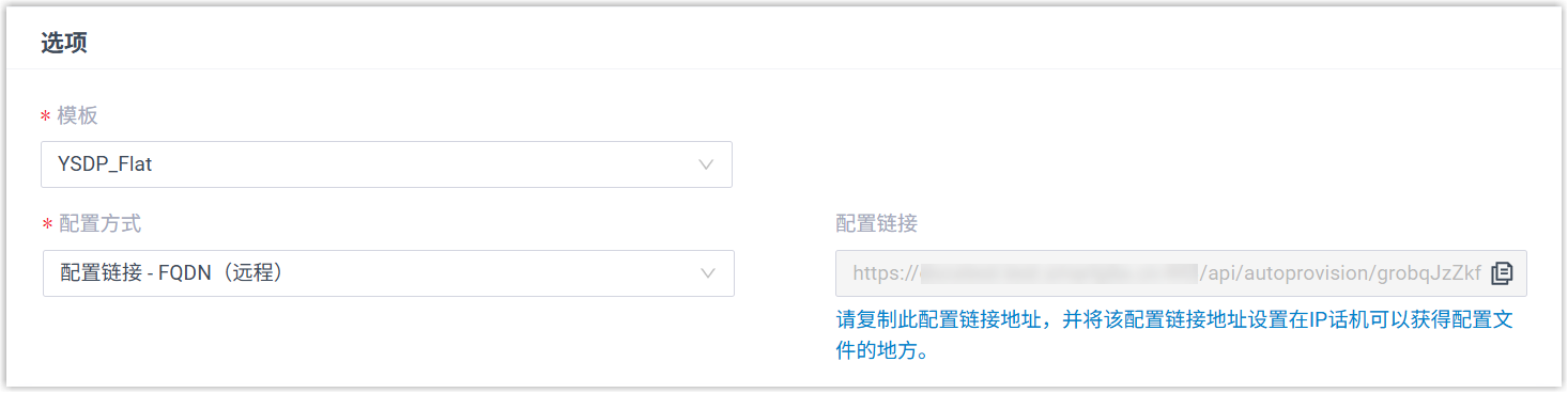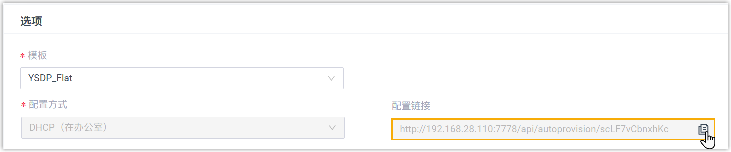 PBX 自动生成一个配置链接,显示在 配置链接 字段中。此链接指向话机配置文件所存储的位置。