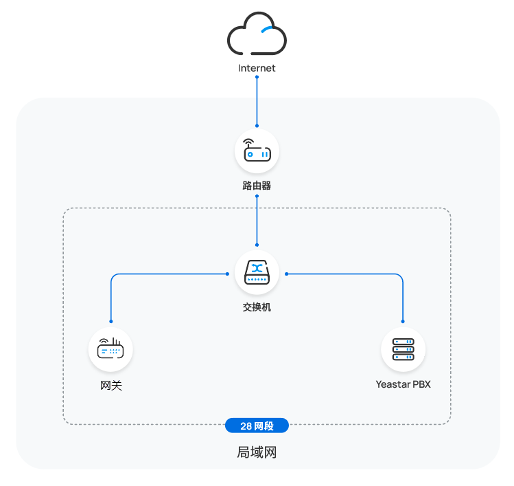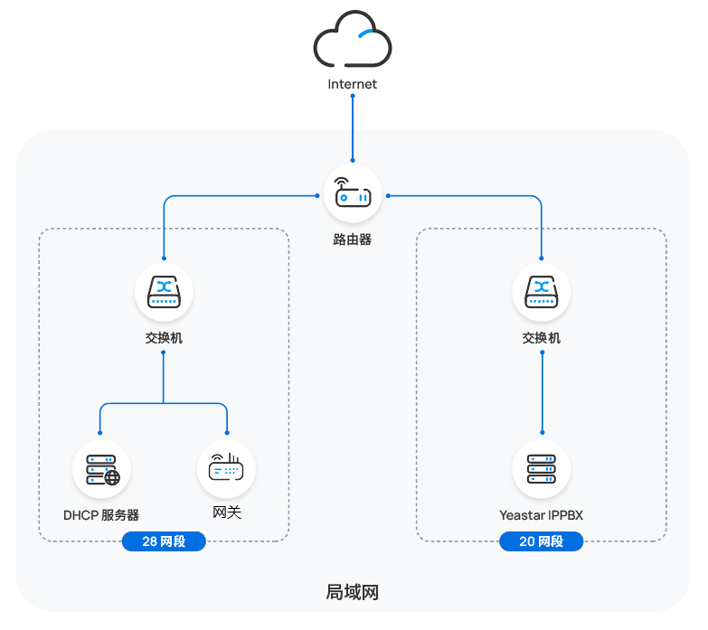 在本例中,潮流网关和 Yeastar PBX 部署在不同的网络中。网关所在网络配置了 DHCP 服务器,用于向网关下发 IP 地址以及从 PBX 中获取的配置链接。