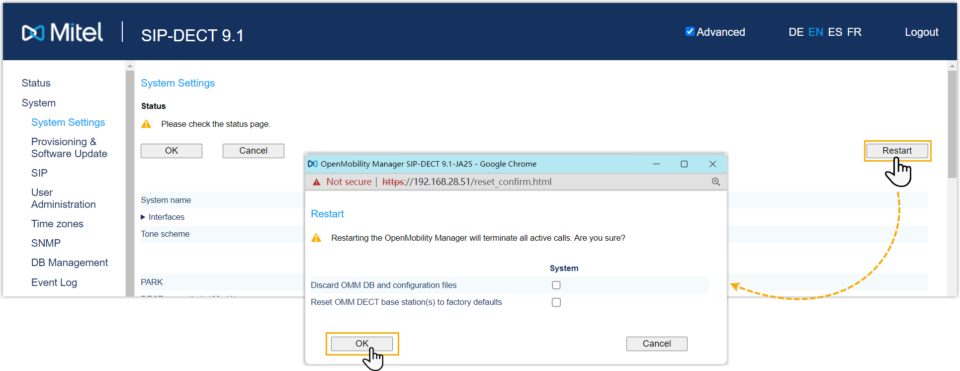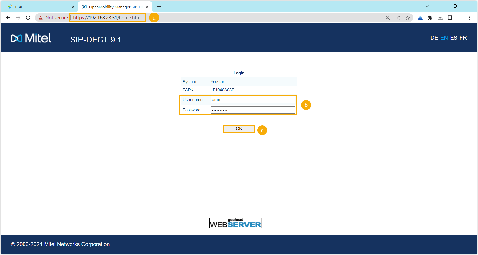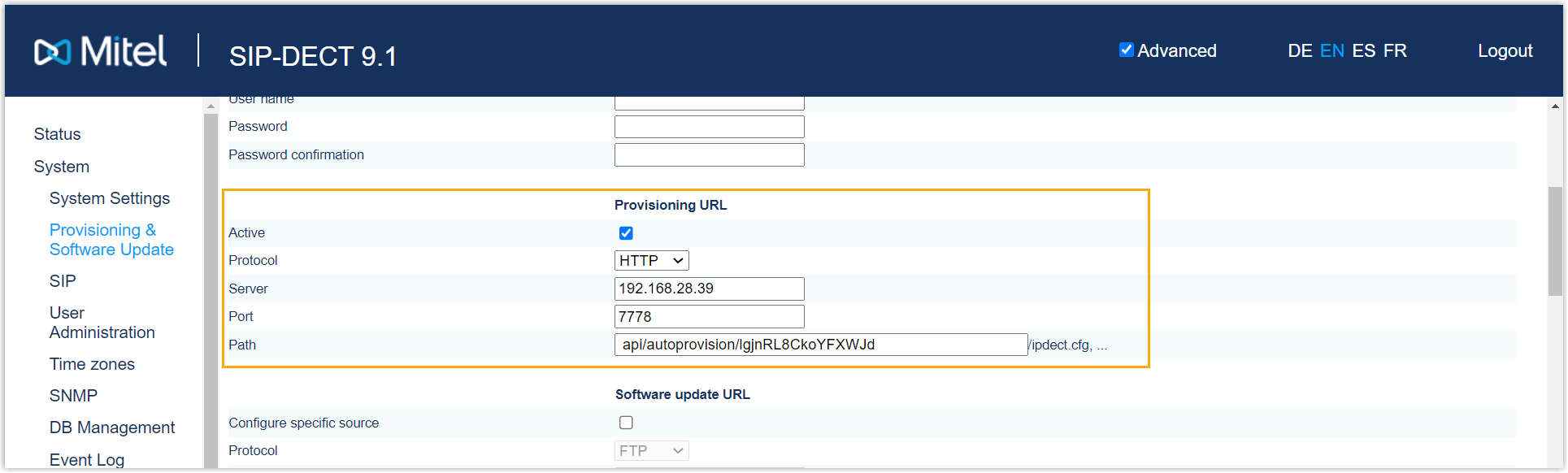 步骤二、在 Mitel DECT 基站上设置配置URL