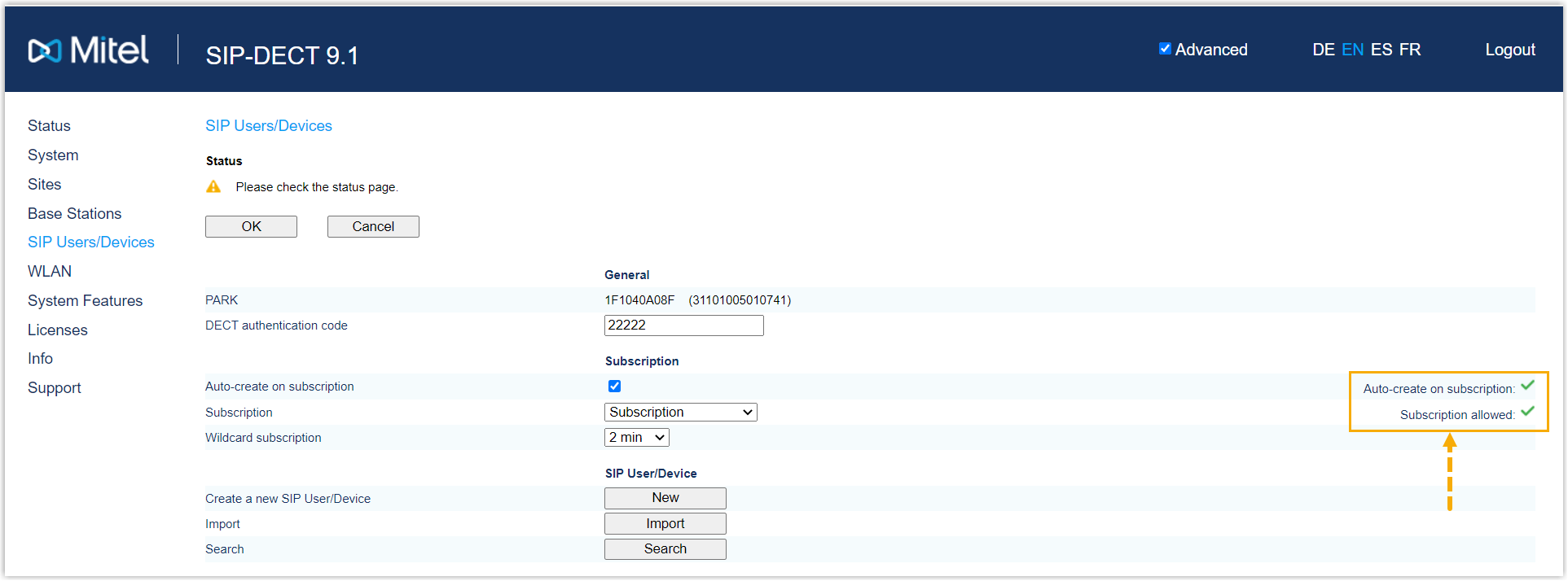 - 在 DECT 基站的网页中,可在 中查看 DECT 手柄的订阅状态。