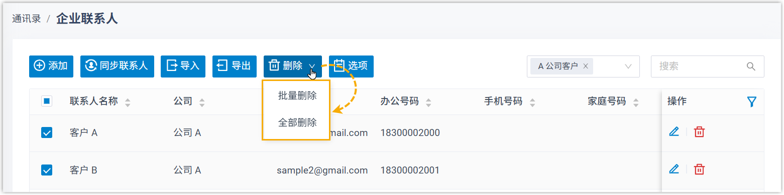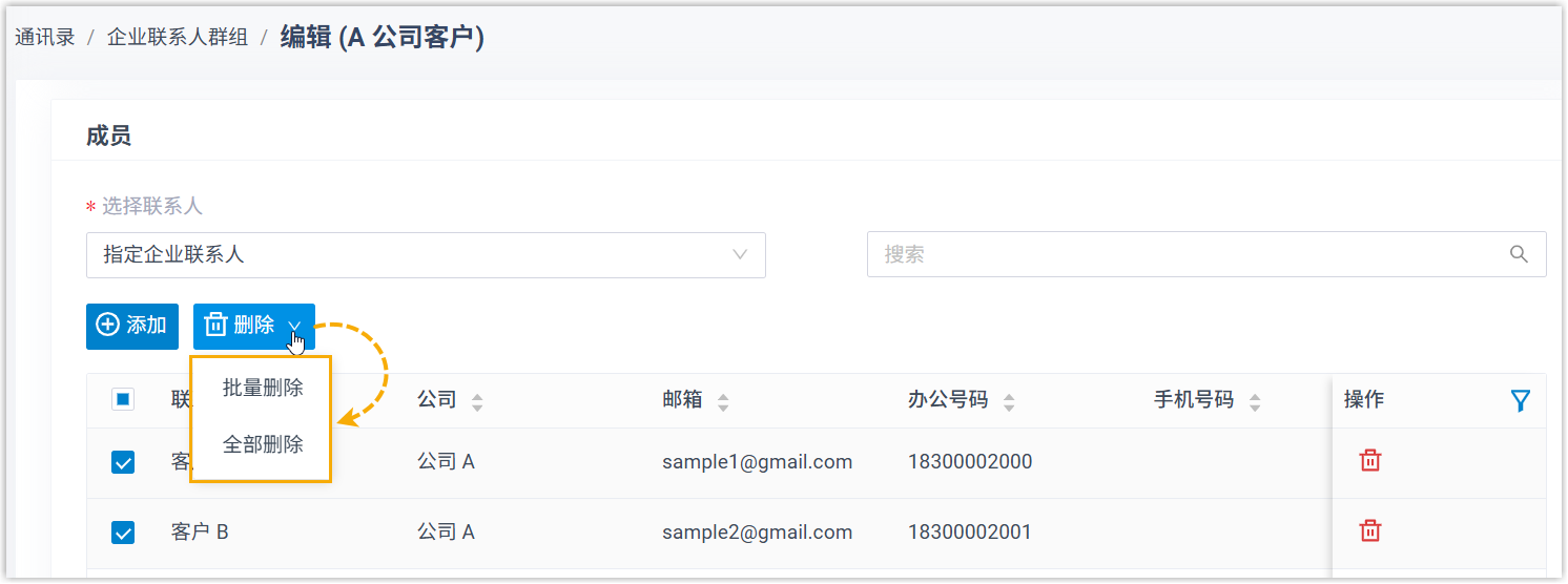 - 支持将多个或全部企业联系人从指定联系人群组中批量移除。
