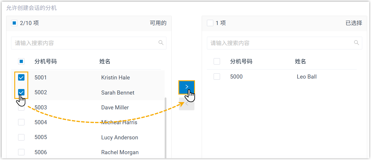 允许创建会话的分机,允许你选择可以通过此渠道向外部用户发送消息的分机。
