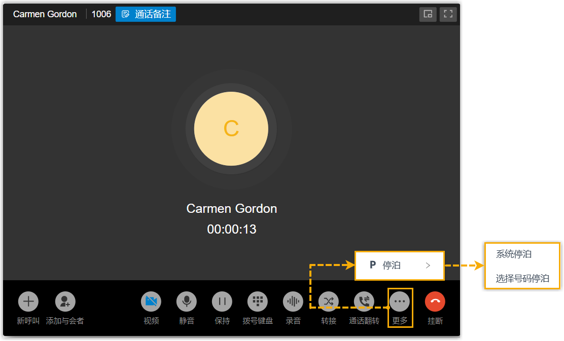 支持直接通过按键停泊通话。分机用户可在通话窗口中点击 停泊 按键,将通话停泊至系统自动分配的停泊号码或手动选择的停泊号码。