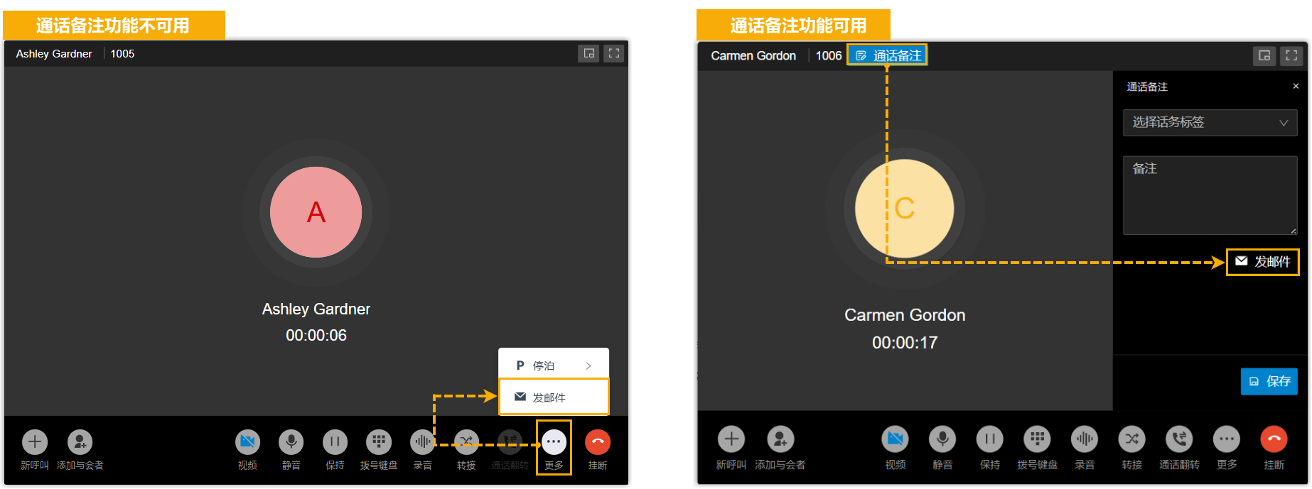 - 优化盲转的来电显示:当通过盲转的方式转接通话时,接收方将看到被转接方的来电信息而非转接执行者的信息,从而快速了解来电者的身份。