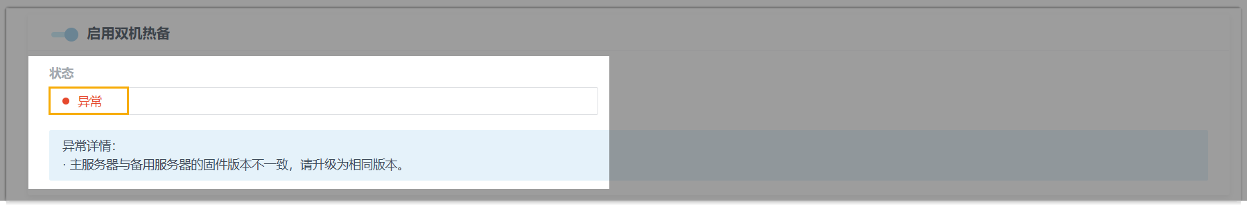 异常,且系统提示固件不匹配,需将两台服务器升级至相同版本,以确保热备功能正常运行。