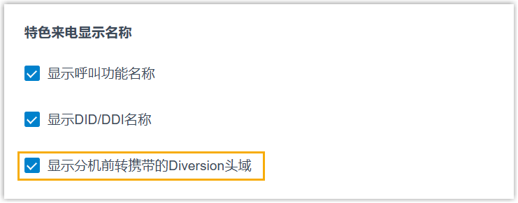 若启用,当分机来电被前转至 分机前转携带Diversion头域 (路径:) 中指定的目的地类型时,来电显示将展示前转来电的分机名称和号码。