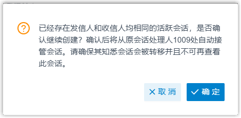 启用后,若分机用户在 Linkus 客户端上创建会话时,渠道中已存在相同发送方和接收方的活跃会话,Linkus 将弹出以下提示。如果用户继续操作,原始会话将被该用户接管,并带有完整聊天记录。