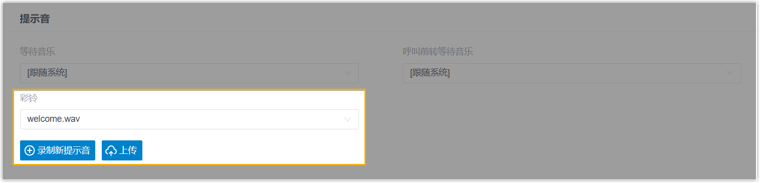 - 支持为分机配置彩铃 (路径:)。当分机接到来电时,系统将在分机用户接听前向主叫方播放该铃声。