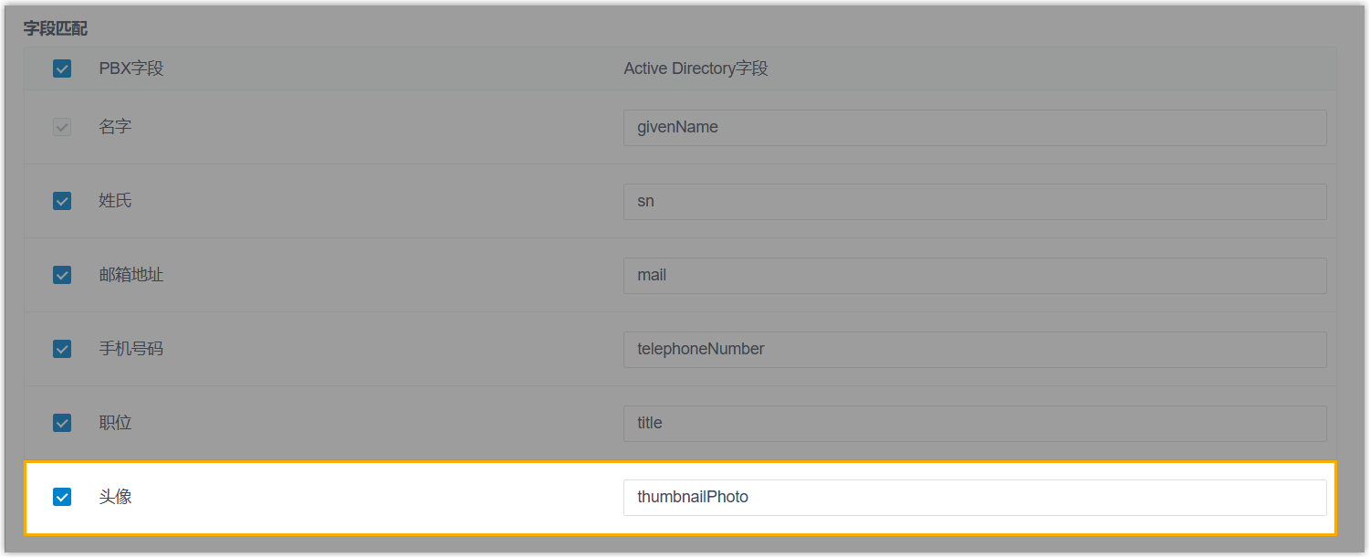 头像。若勾选,系统将从 AD 域中同步用户头像至 PBX 分机。