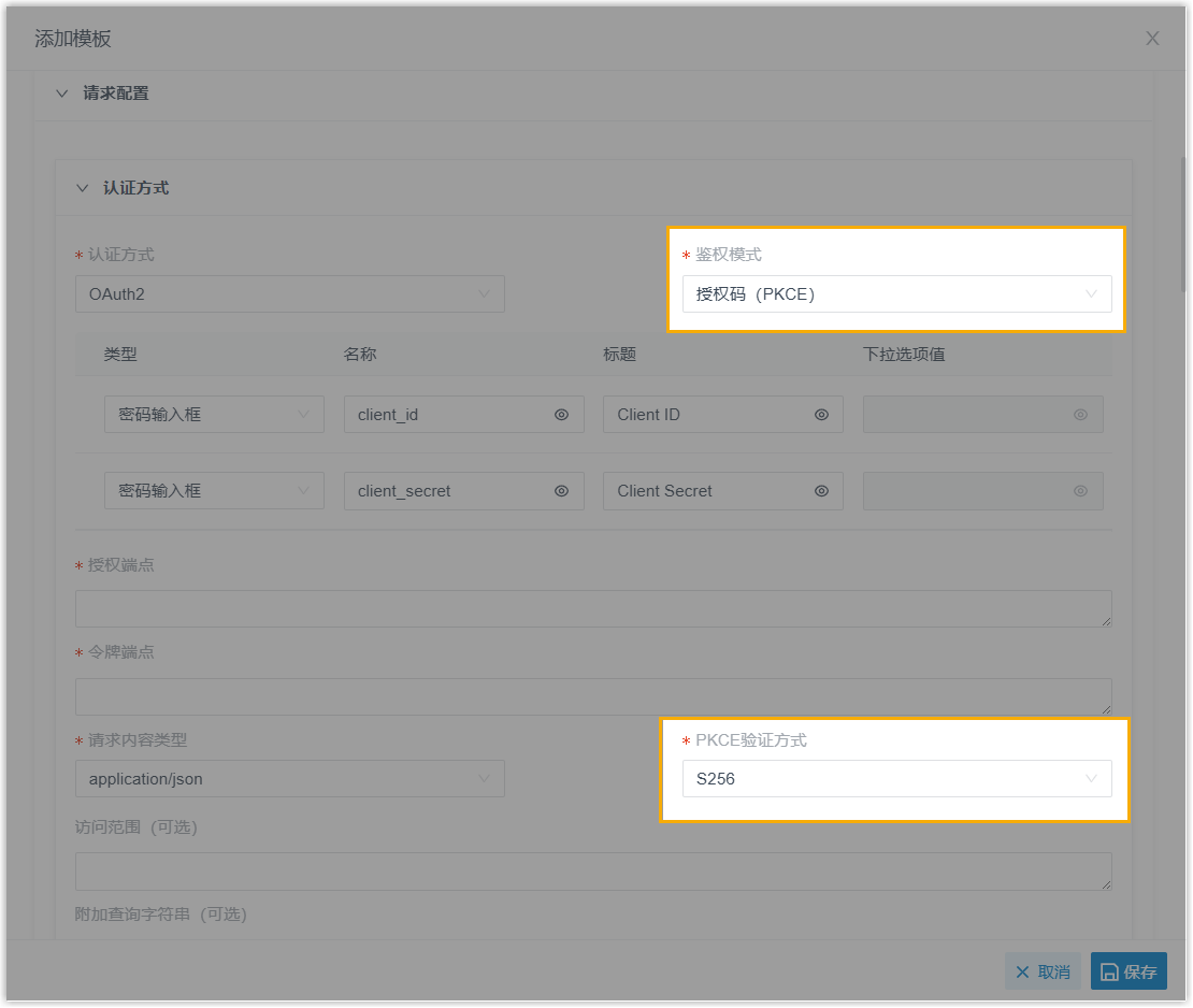 在集成模板中配置 OAuth 2.0 认证时,可通过新增的 鉴权模式 和 PKCE 验证方式 配置项 (路径:) 来启用此模式。该模式使用 challenge-verifier 密钥对替代客户端密钥进行授权,可有效防止授权码被拦截,提高安全性。