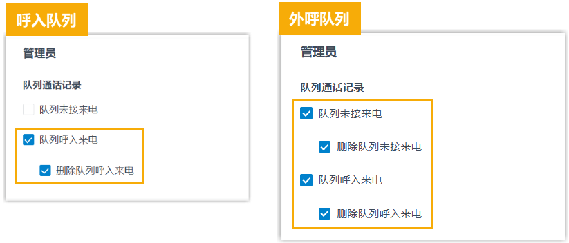 配置项 说明 外呼队列 队列未接来电 启用后,队列管理员可查看队列中未接来电的通话记录。 删除队列未接来电 启用后,队列管理员可删除队列中未接来电的通话记录。 注: 若删除,该队列的所有坐席及管理员均无法查看被删除的记录,但记录仍保留在通话记录中。呼叫队列 & 外呼队列 队列呼入来电 启用后,队列管理员可查看队列中所有已接来电的通话记录。 注: 仅支持查看 83.21.0.117 或更高版本中生成的通话记录,不支持此版本之前的历史队列通话记录。删除队列呼入来电 启用后,队列管理员可删除队列中的已接来电的通话记录。 注: 若删除,该队列的所有坐席及管理员均无法查看被删除的记录,但记录仍保留在通话记录中。 -
