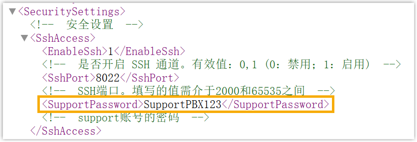 support,密码为 PBX Web 界面中配置的控制台密码 (路径:) 或 XML 文件中配置的密码。图 1. PBX Web 界面中配置的 Support密码