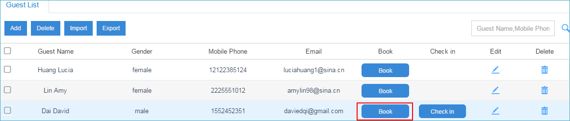 如果客户是第一次来酒店入住,前台人员可以在 预订列表 页面,为新客户预订房间。