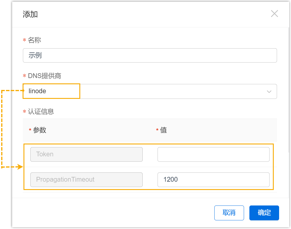 提供商信息时,系统会根据你的选择自动显示指定 DNS 提供商所需的认证参数,无需手动添加。