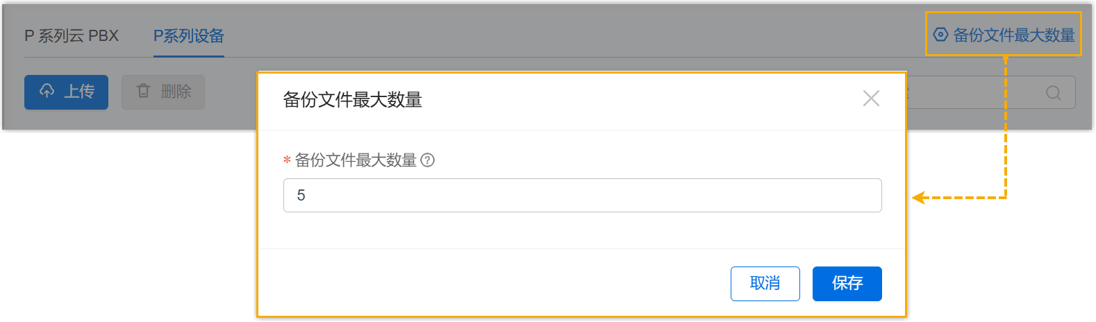 - 优化备份包功能:新增配置项 备份文件最大数量,可用于设置在 Yeastar 统一管理平台中每台 P 系列云 PBX 或远程连接的 P 系列硬件版 / 软件版可保留的最大备份文件数量,包含任务自动生成和手动上传的备份文件。