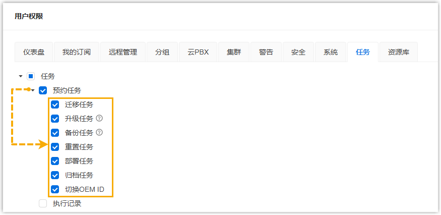 细分预约任务的类型,支持为同事账号和下级账号分配具体类型任务的访问和使用权限。