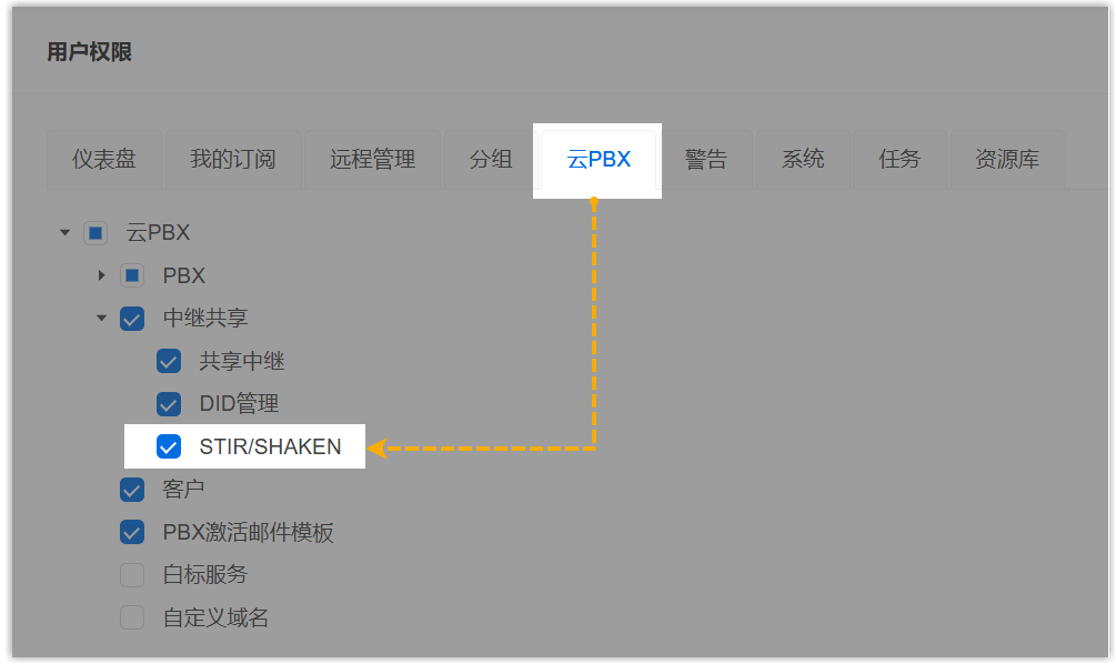 - 支持为同事账号或下级账号分配 STIR/SHAKEN 权限,允许用户管理全局的