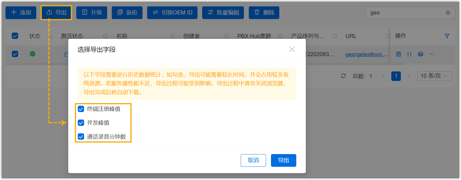 - 优化 PBX 导出功能:导出云 PBX 时,你可以根据需要选择特定的资源使用数据字段,以在下载的 PBX 信息中包含指定数据。