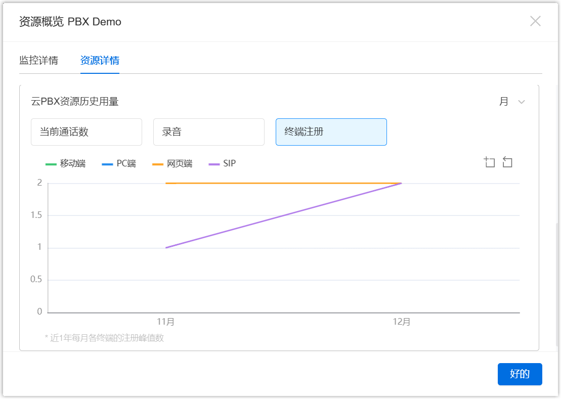 个月内的注册峰值及其历史趋势。注: 此功能仅从固件为 84.21.0.66 或更高版本的 P 系列云 PBX 上采集对应数据。你可以基于以下范围查看该监控数据。