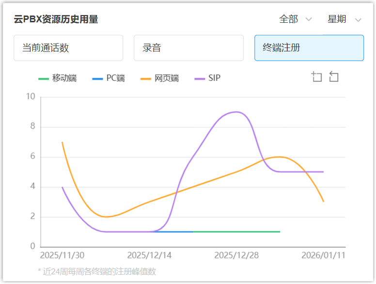- 支持监控 P 系列云 PBX 上不同终端类型的注册峰值,并可按终端类型 (Linkus 客户端和 SIP 终端) 直观展示过去 24 周或 12