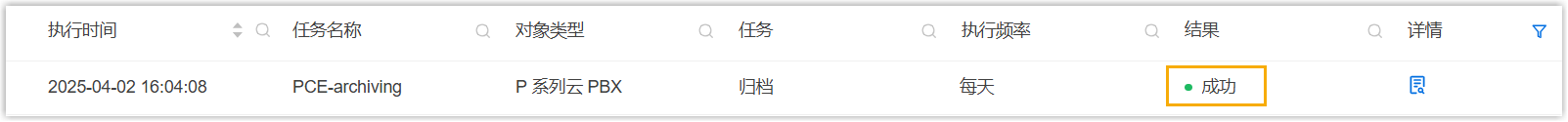 - 在 Yeastar 统一管理平台,进入 。若任务的 结果 栏显示 成功,则表示指定文件已成功归档到 Amazon S3。
