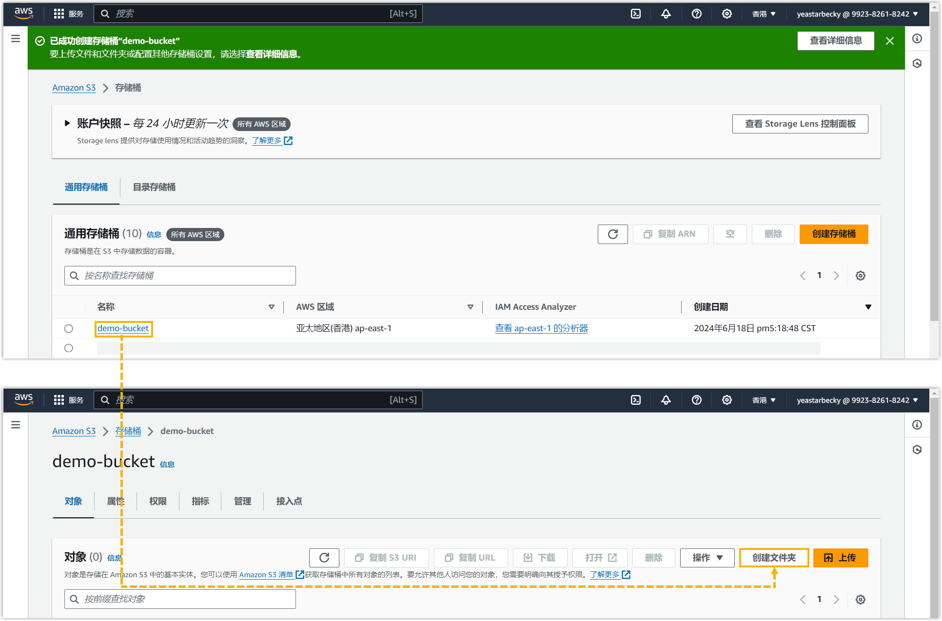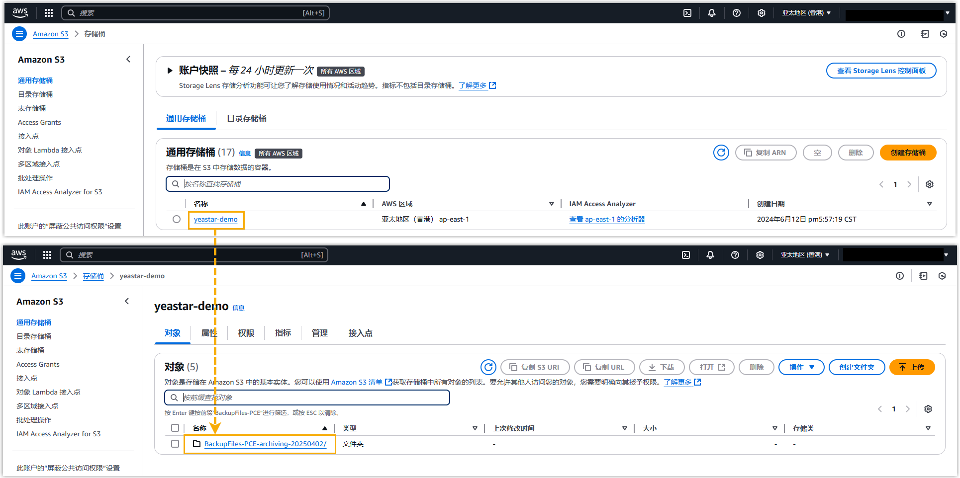 - 在 AWS 管理控制台,进入创建的 S3 存储桶。如果指定文件出现在列表中,表明归档成功。