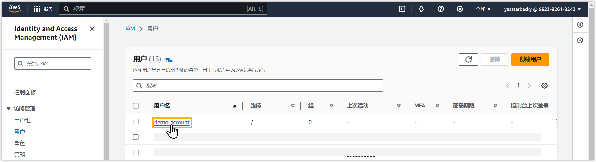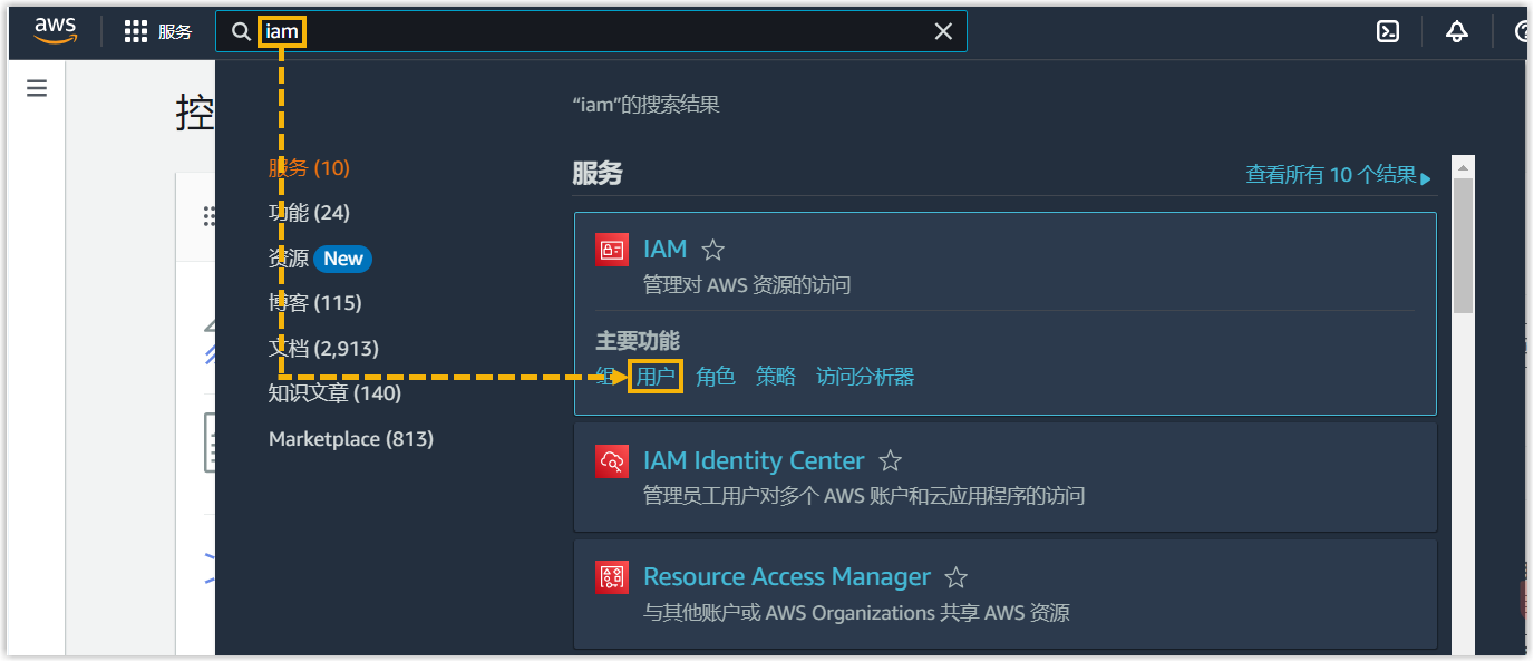 - 在控制台顶部,搜索 IAM 服务并选择 用户。