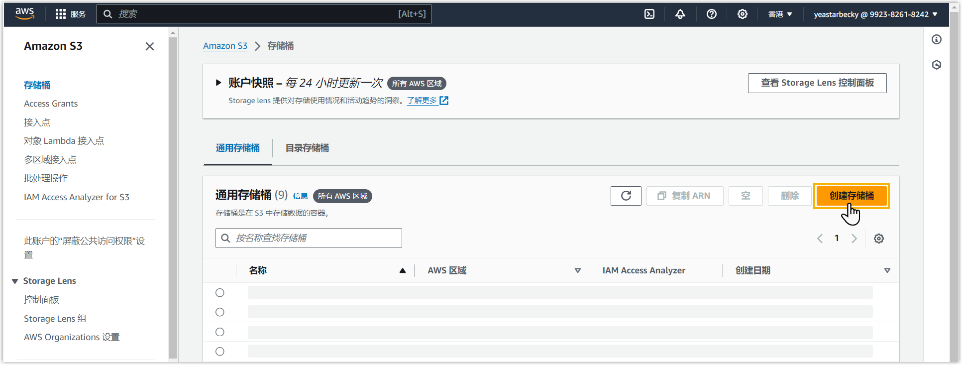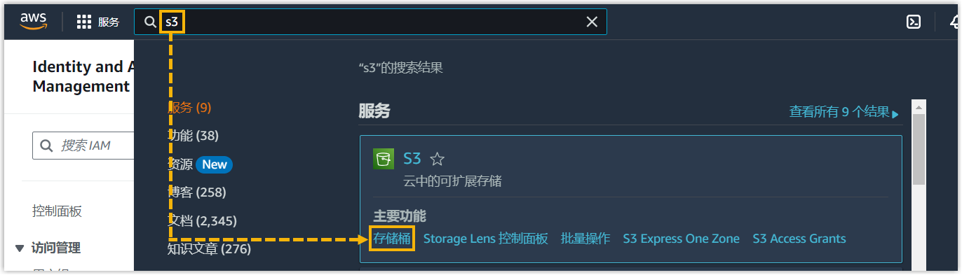 - 在 AWS 控制台顶部,搜索 S3 服务,然后选择 存储桶。