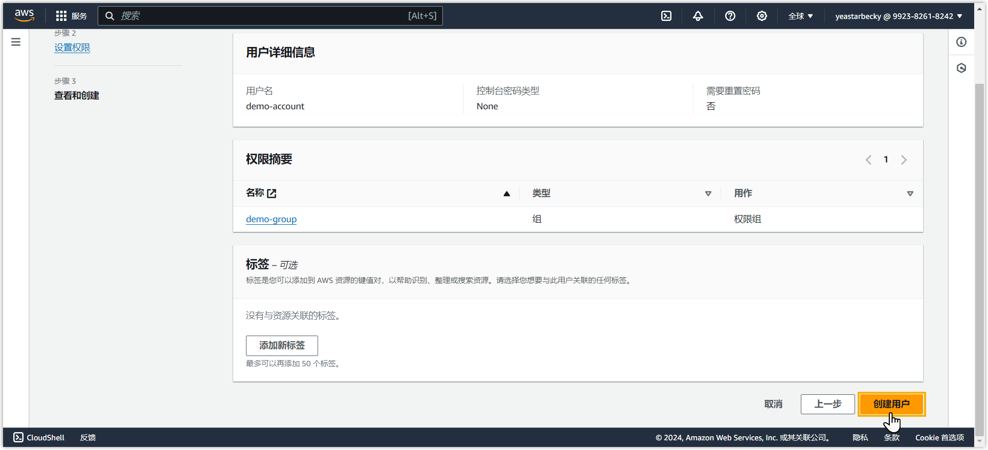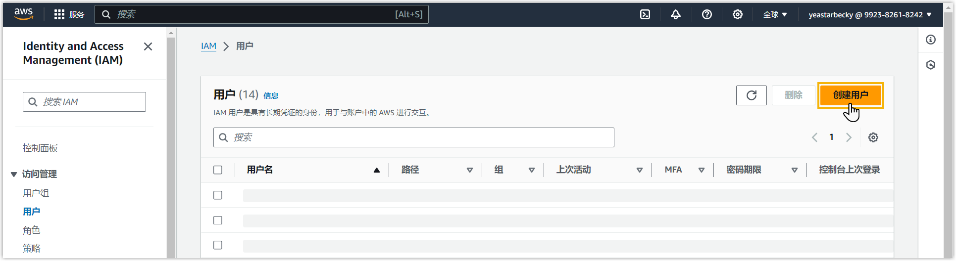 - 点击右上角的 创建用户。