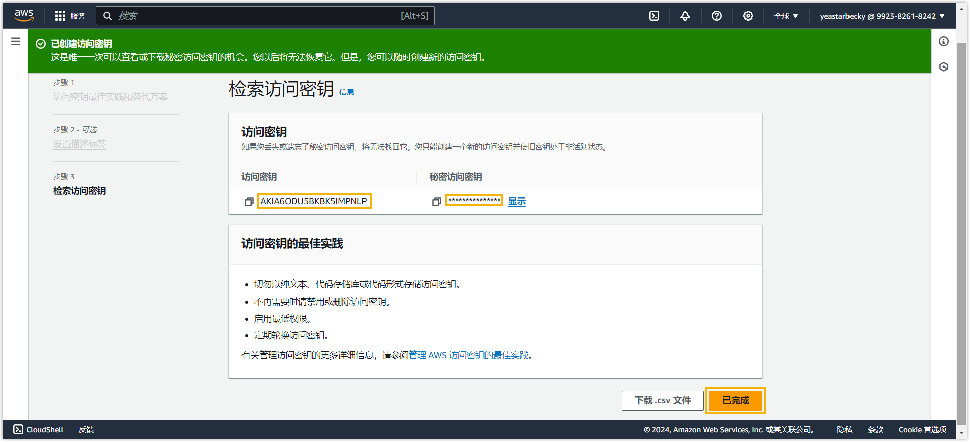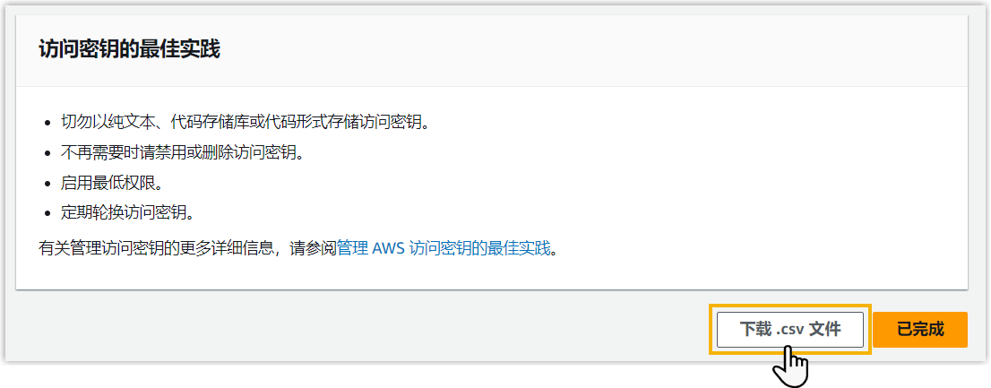 的值,然后点击 已完成。重要: 秘密访问密钥 的值仅显示一次,因此确保你在关闭窗口之前已将此密钥存储在安全位置。我们建议你点击 下载 .csv 文件 将此密钥文件保存到本地电脑。