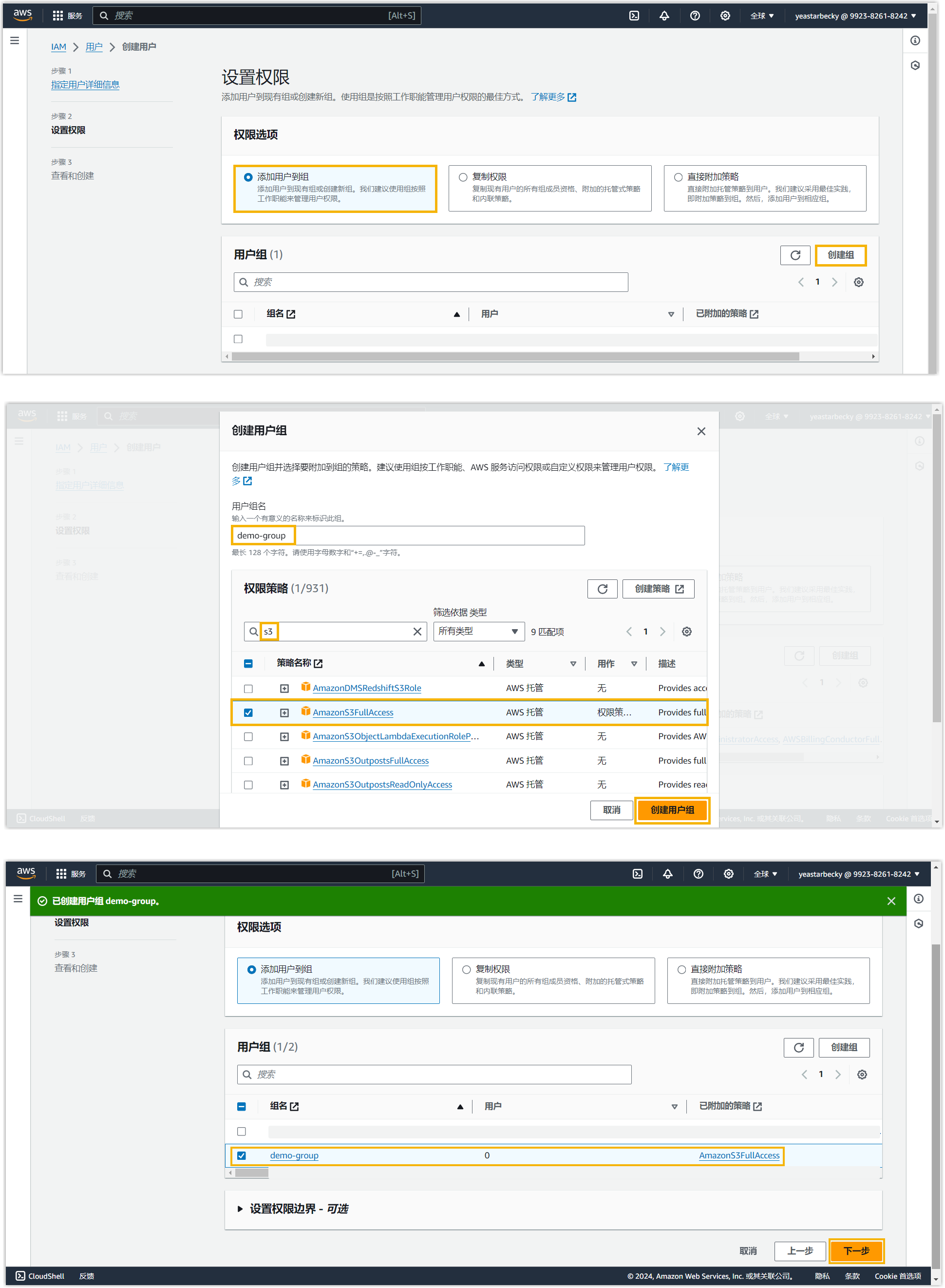 在本例中,我们创建一个具有 Amazon S3 完全访问权限的新组,并将用户添加到该组。