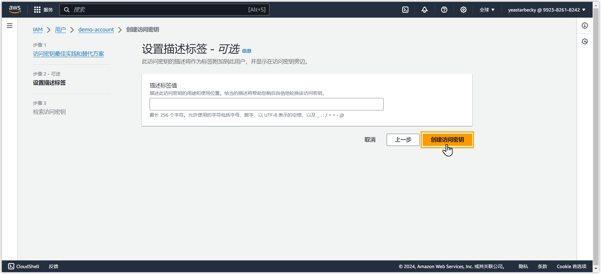- 在 设置描述标签 - 可选 页面,根据你的需要填写密钥描述,然后点击