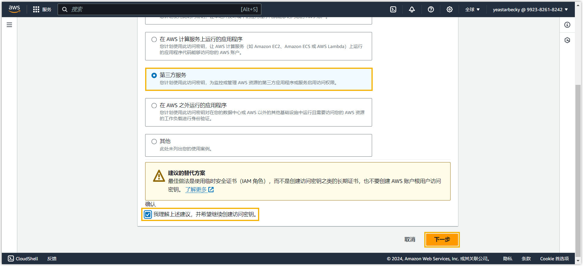 - 在 访问秘钥最佳实践和替代方案 页面,选择