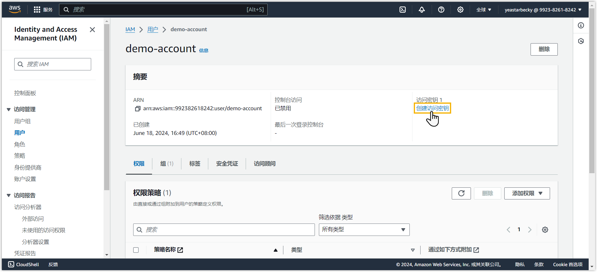访问密钥已创建成功,并显示在访问密钥列表。