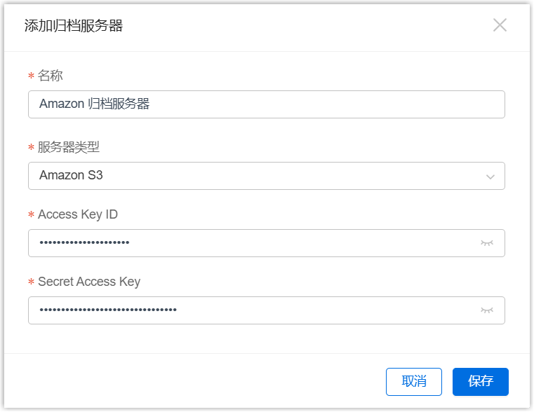 设置 说明 名称 填写一个名称,帮助你识别此服务器。 服务器类型 选择 Amazon S3。 Access Key ID 填写 从 AWS 获取到的访问密钥。 Secret Access Key 填写 从 AWS 获取到的秘密访问密钥。 - 点击 保存。