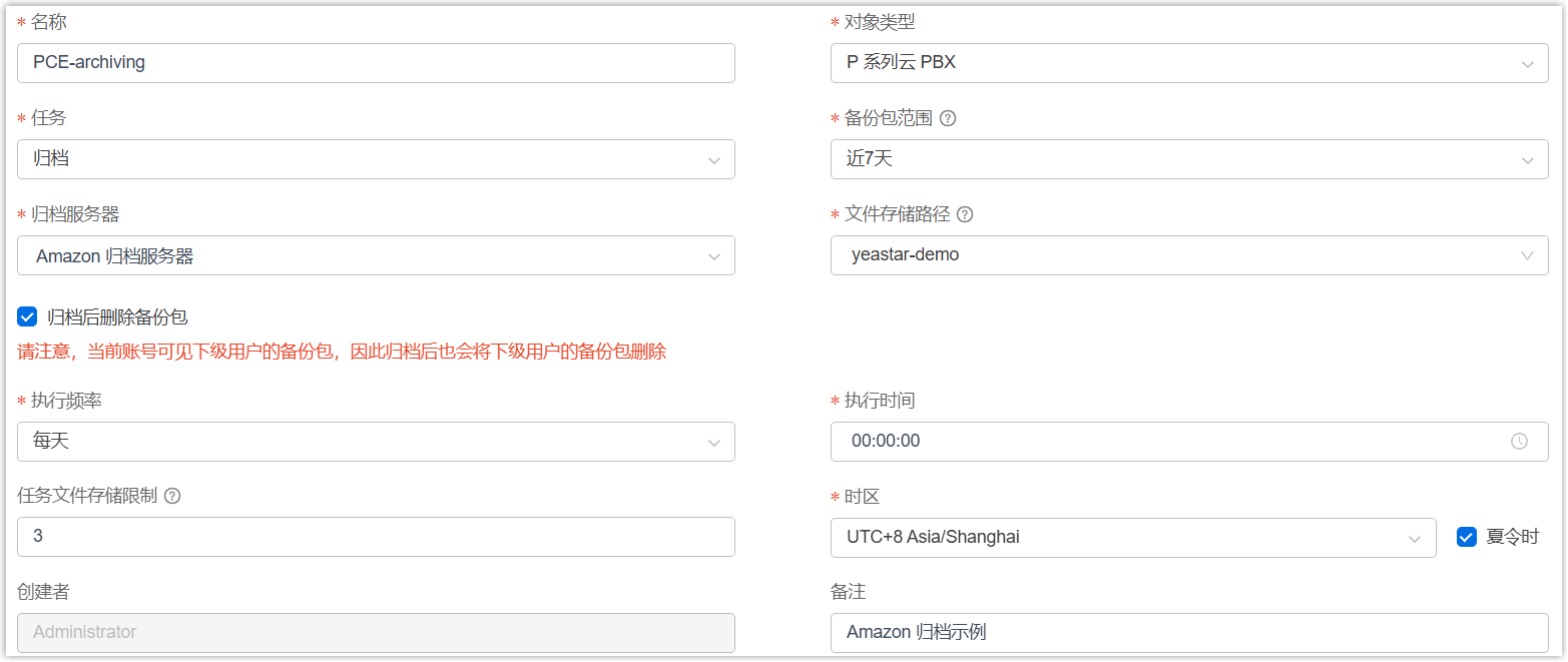设置 说明 名称 填写一个名称,帮助你识别此任务。 对象类型 选择 P 系列云 PBX。 任务 选择 归档。 备份包范围 指定要归档的备份文件的时间范围。 注: 支持一次性归档最多 31 天内的文件。归档服务器 选择 已添加的 Amazon S3 存储桶。 文件存储路径 选择你要归档文件的存储桶或文件夹。 归档后删除备份包 若启用,则 Yeastar 统一管理平台将在成功归档文件后自动删除对应备份文件。 注:- 若有备份文件归档失败,该文件将不会被删除