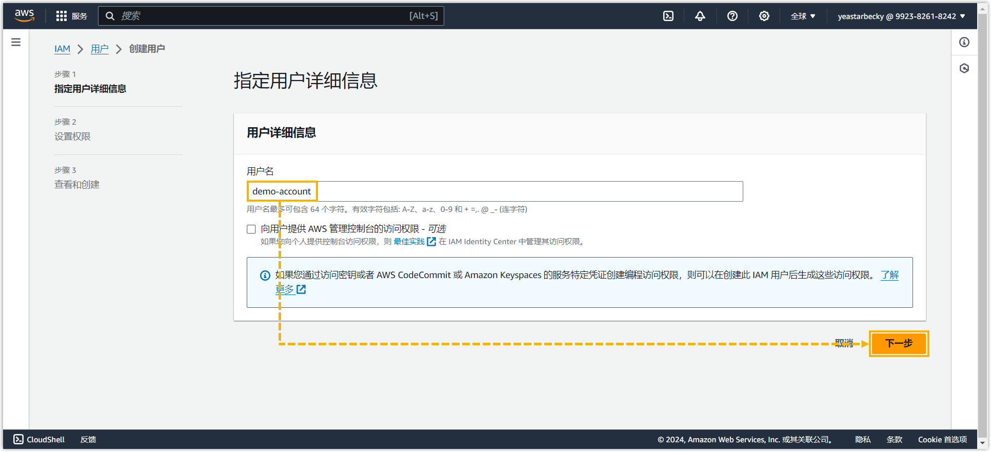- 在 指定用户详细信息 页面,填写一个名称帮助你识别此 IAM 用户,然后点击
