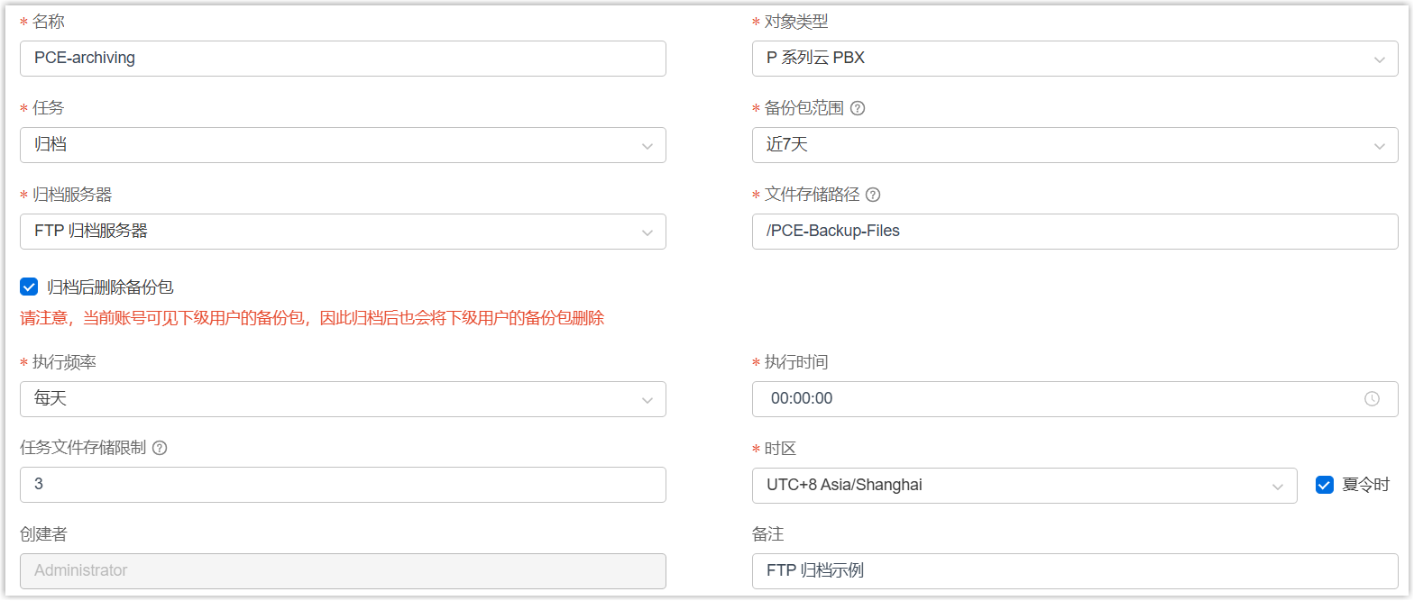设置 说明 名称 填写一个名称,帮助你识别此任务。 对象类型 选择 P 系列云 PBX。 任务 选择 归档。 备份包范围 指定要归档的备份文件的时间范围。 注: 支持一次性归档最多 31 天内的文件。归档服务器 选择 已添加的 FTP 服务器。 文件存储路径 设置要存储归档文件的文件夹路径。 例如:- 要存储到根目录下,输入