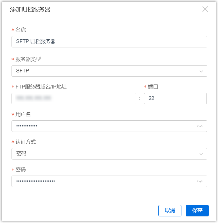 SFTP 服务器已被添加为归档服务器,并显示在列表中。