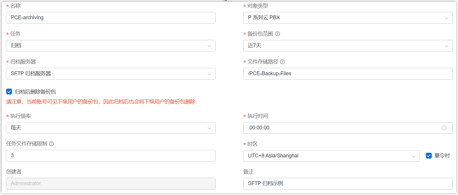 设置 说明 名称 填写一个名称,帮助你识别此任务。 对象类型 选择 P 系列云 PBX。 任务 选择 归档。 备份包范围 指定要归档的备份文件的时间范围。 注: 支持一次性归档最多 31 天内的文件。归档服务器 选择 已添加的 SFTP 服务器。 文件存储路径 设置要存储归档文件的文件夹路径。 例如:- 要存储到根目录下,输入