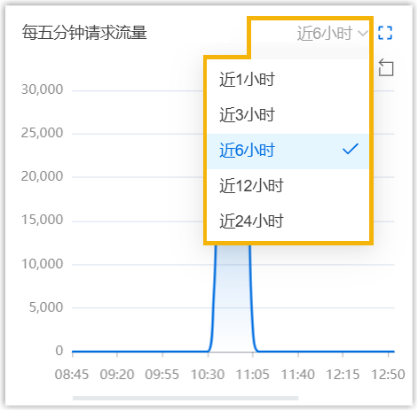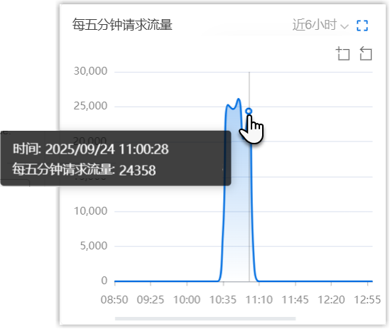 - 要查看 API 请求流量的详细信息,将鼠标悬停在折线图中的数据点上。对应数据点的提示框将显示该时间点前 5 分钟内的 API