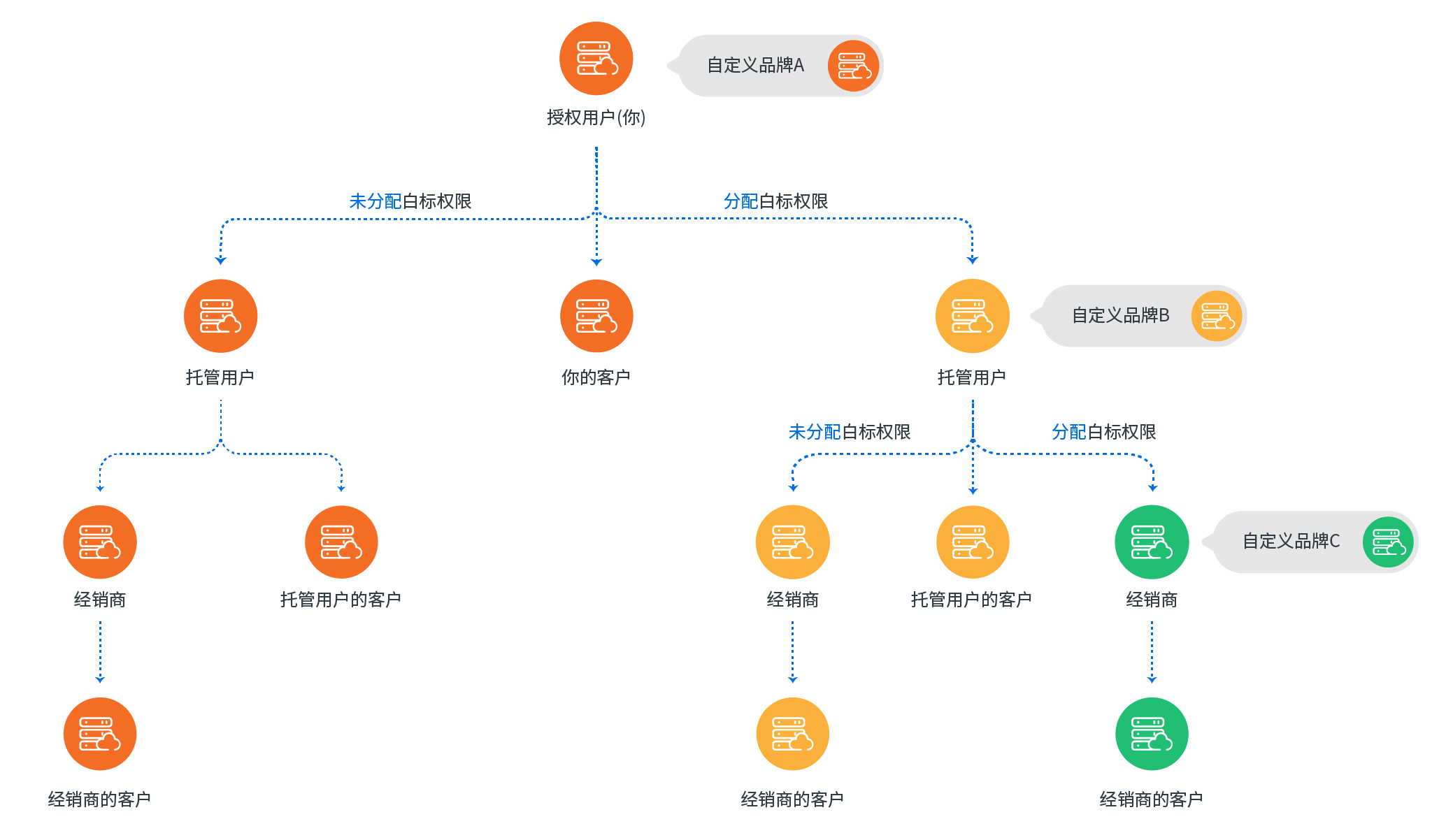 授权用户可以分配白标权限给同事,以便协作管理白标模板,也可与分配给托管用户。以允许他们自定义品牌。对于未被授予白标权限的托管用户,他们创建的云 PBX 将自动沿用你的白标设置。