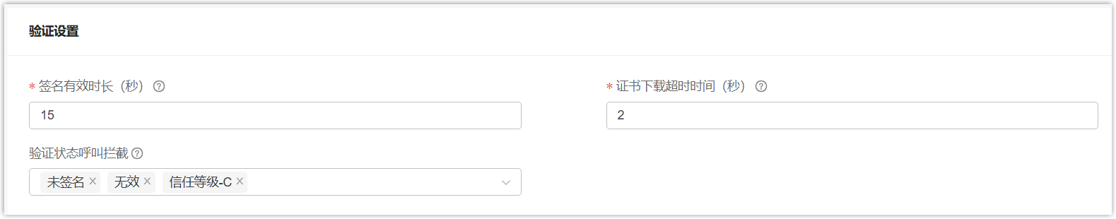 设置 说明 签名有效时长 (秒) 设置签名的有效时长。 若签名与验签的时间差超过此设定值,则视为签名无效。