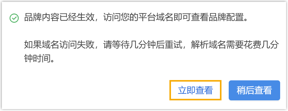 品牌设置已应用。你可以点击 立即查看 来访问你自定义的平台。
