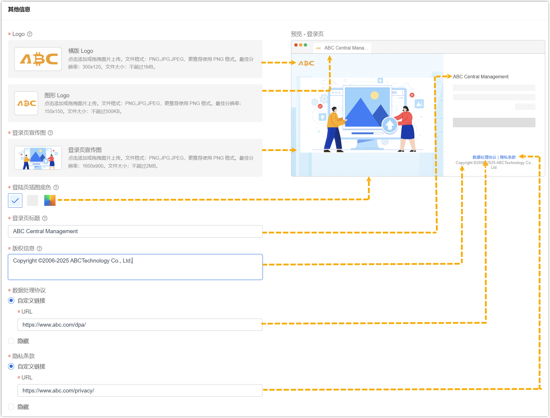 登录页插图底色 选择登录页面插图的背景颜色。 登录页标题 设置登录页面的标题。 版权信息 输入版权信息。 该信息将显示在平台登录页面的底部。