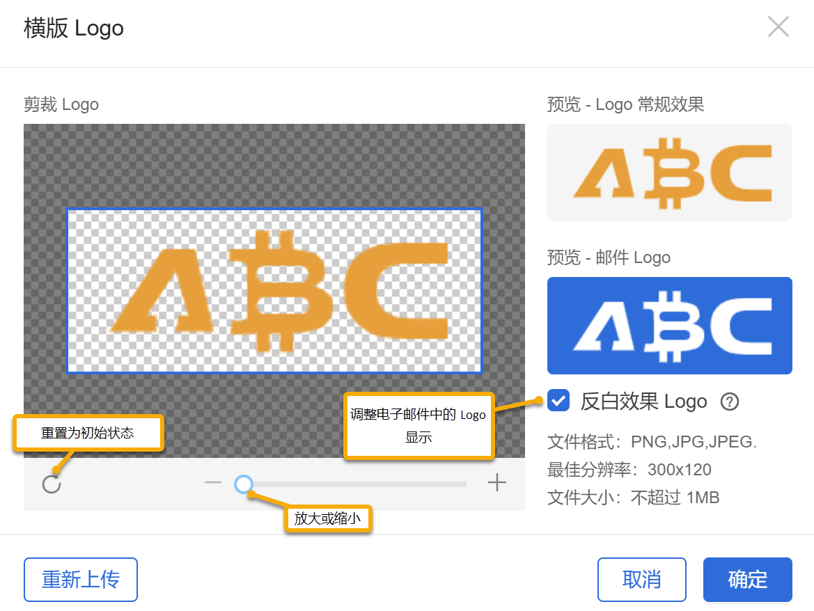 logo 将会显示在平台登录页面、通知邮件以及任何需要 logo 的地方。