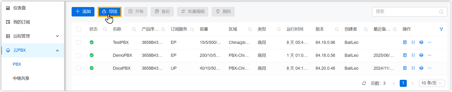 - 导出所有 P 系列云 PBX 的信息,点击 导出。