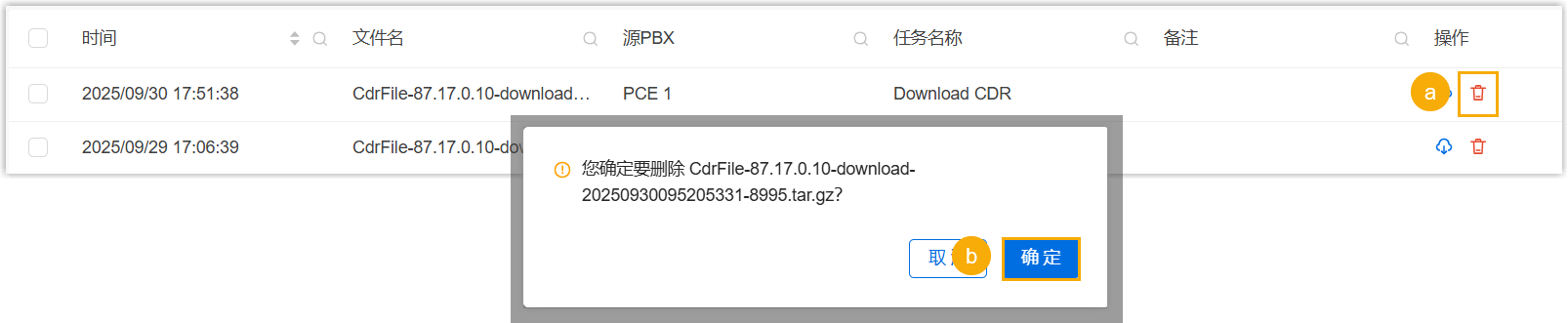 - 要删除多个通话记录文件,勾选要删除的文件并点击 删除,然后在弹出的窗口中点击