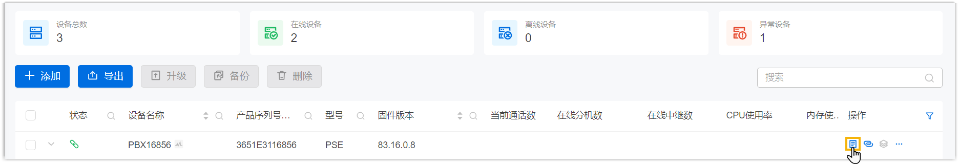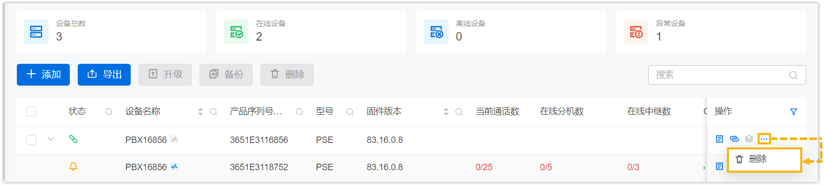 管理设备 本文介绍如何编辑或删除设备。 编辑设备 登录 Yeastar 统一管理平台,进入 远程管理 > 我的设备。 在设备右侧,点击 。 编辑设备信息。 点击 保存。 删除设备 登录 Yeastar 统一管理平台,进入 远程管理 > 我的设备。 在设备右侧,点击 ,然后点击 删除。 在弹出的窗口中,点击 确定。